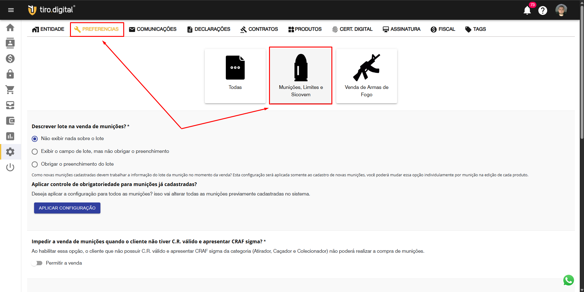 Acesse a aba de preferências, em seguida o CARD de Munições, Limites e Sicovem.