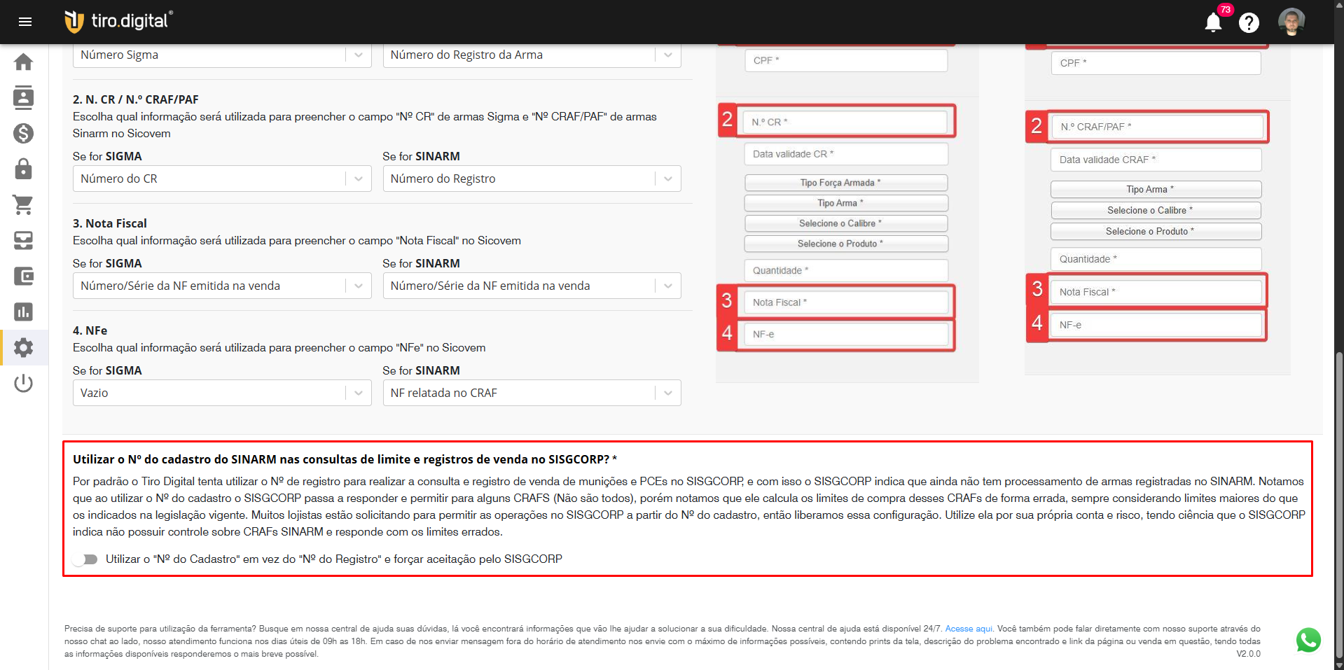 Por padrão, o Tiro Digital utiliza o Nº de Registro para realizar consultas e registrar vendas de munições e PCEs no SisGCorp.